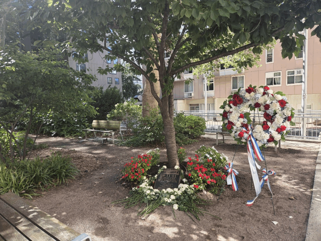 Floral wreath and white roses placed at the 9/11 Roosevelt Island Memorial