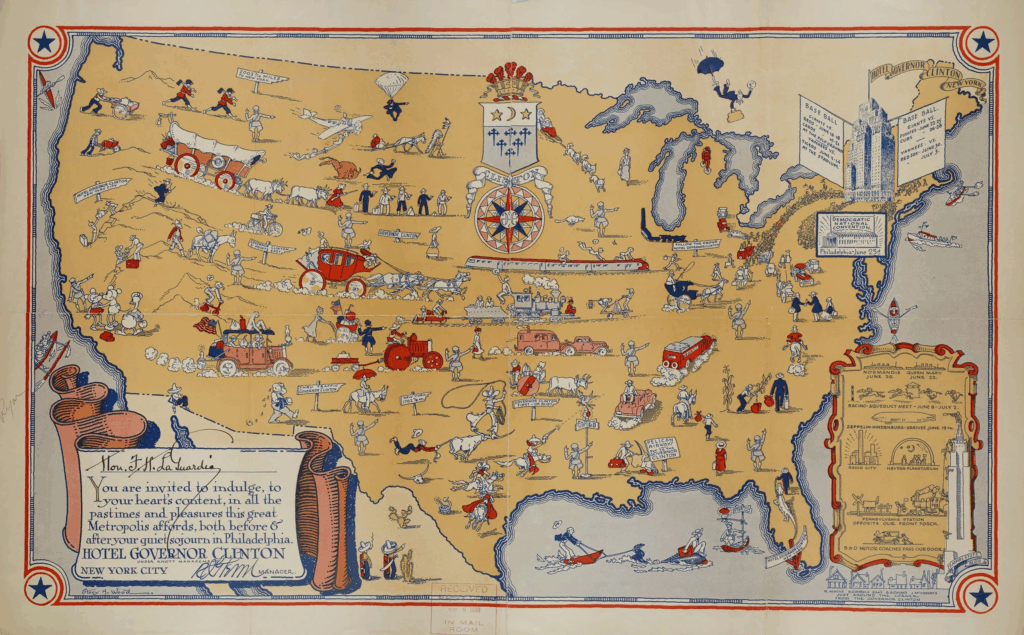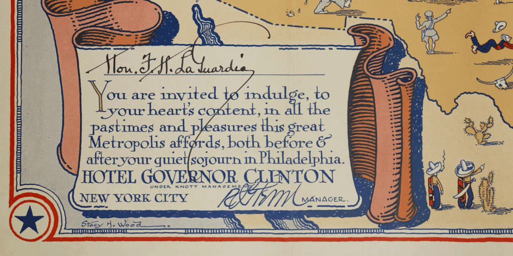 Measuring 18 by 28.5 inches, the map depicts the United States decorated with clever cartoon figures and illustrations. It had been sent to Mayor Fiorello LaGuardia from the Hotel Governor Clinton, located on Seventh Avenue and 32nd Street in Manhattan. The Mayor’s mail room clerk date-stamped it received on June 9, 1936.