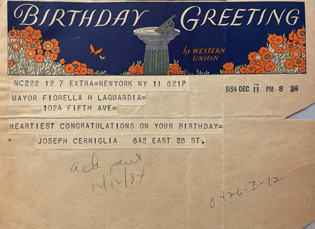 Western Union telegram, 1934. Mayor LaGuardia papers, NYC Municipal Archives.