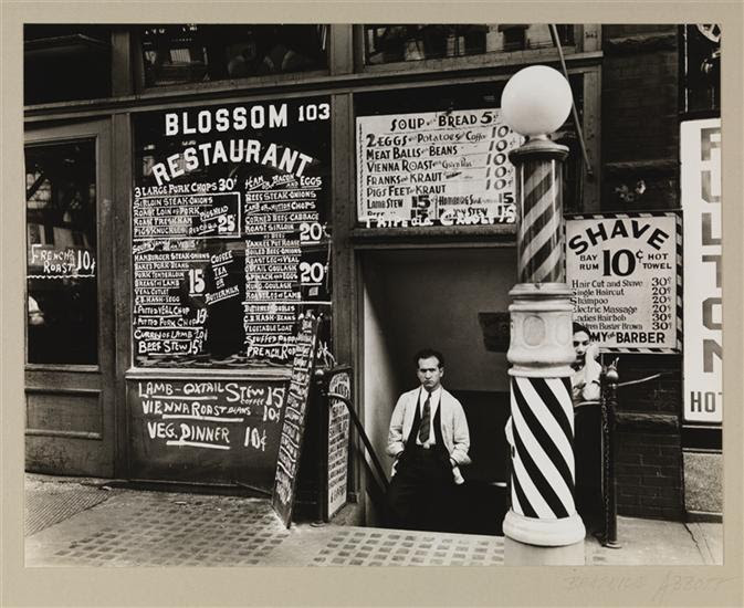 Photographer Berenice Abbott (1898-1991) Accession number 40.140.10 Unique identifier MNY18125 Description The window of the Blossom Restaurant, occupying the ground floor, and Jimmy’s Barber Shop, occupying the basement, of the Boston Hotel, a flophouse at 103-105 Bowery. Dated October 24, 1935 Object Type photograph Inscription / technical details Federal Art Project stamp and title, location, date and Abbott number inscribed in ink, mount verso bottom right.