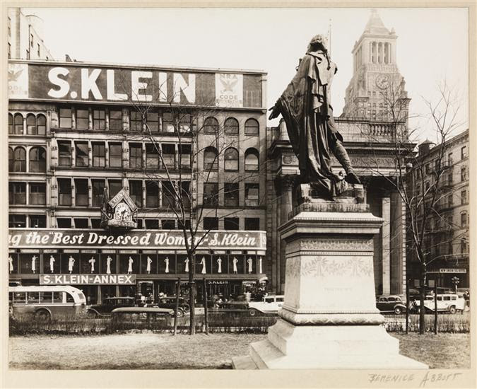 Photographer Berenice Abbott (1898-1991) Creator Berenice Abbott (1898-1991) Accession number 89.2.2.16 Unique identifier MNY201961 Description Fourth Avenue between East 15th and 16th Streets. The Lafayette Statue at Union Square with the discount department store, S. Klein, the Union Square Savings Bank and the tower of the Consolidated Edison Building in the background. Dated March 20, 1936 Object Type photograph Inscription / technical details Federal Art Project stamp and title, location, date and Abbott number inscribed in pencil on mount verso, bottom left. | Federal Art Project sticker adhered to mount verso, bottom right.