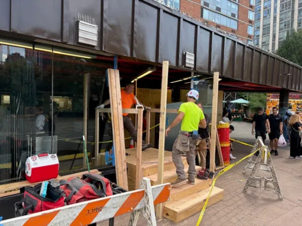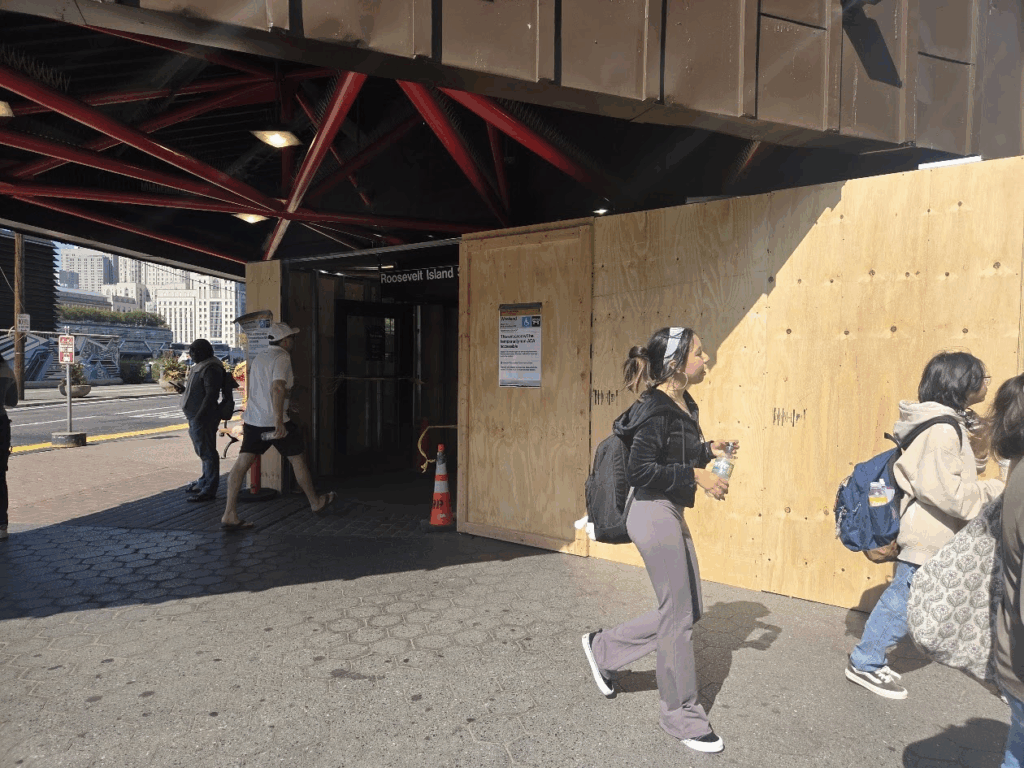 AFTER YEARS OF BROKEN DOORS, HELD OPEN BY SAFETY TAPE, THE MTA IS INSTALLING NEW DOORS THIS WEEKEND, BUT THERE WERE MANY GLITCHES, LIKE HAVING PEOPLE WALK UP AND OVER 4 STEPS TO ENTER THE STATION………