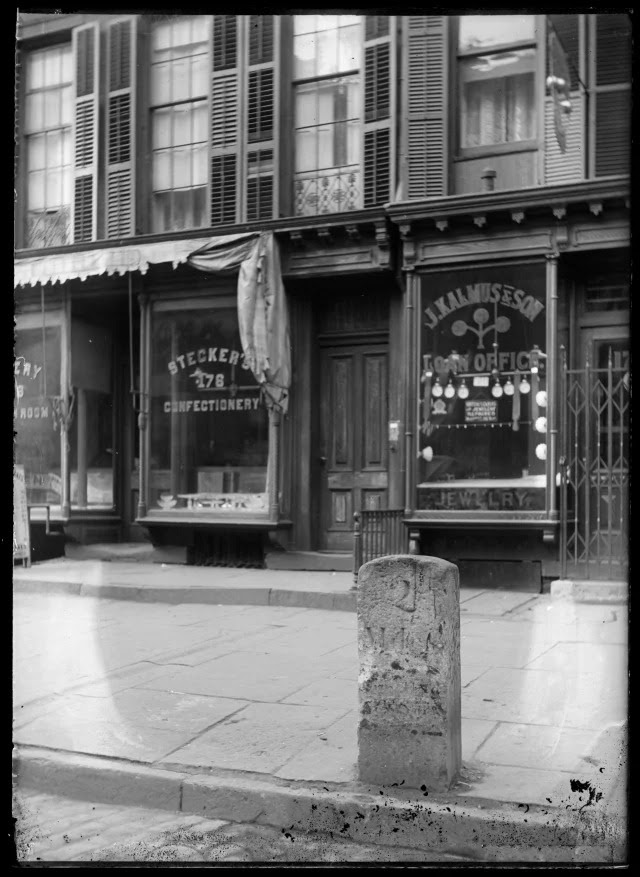In 1904, just three of the original milestones still existed, according to a New York Times article from that year. These included mile marker 2 as well as mile marker 1, which stood in front of 213 Bowery near Rivington Street (fourth photo, from 1897).