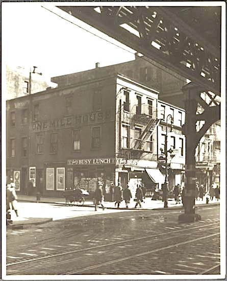 Incredibly, the one-mile marker existed at its original Bowery location until 1926, when a truck destroyed it, according to Kevin Walsh writing in SpliceToday in 2024. Keeping its memory alive was a 20th century tavern at this location called the One Mile House (see the lettering on the side of the building), visible in the photo below from 1932.