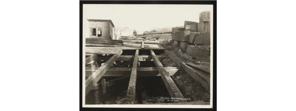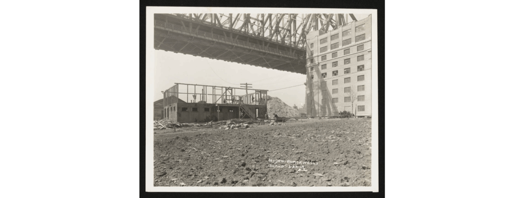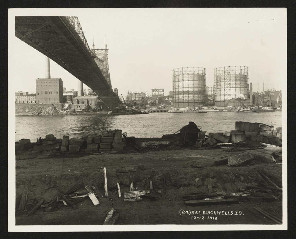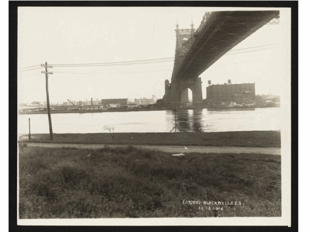 Looking south from under the Queensboro Bridge. Building in the rear is Warden’s residence of the Penitentiary
