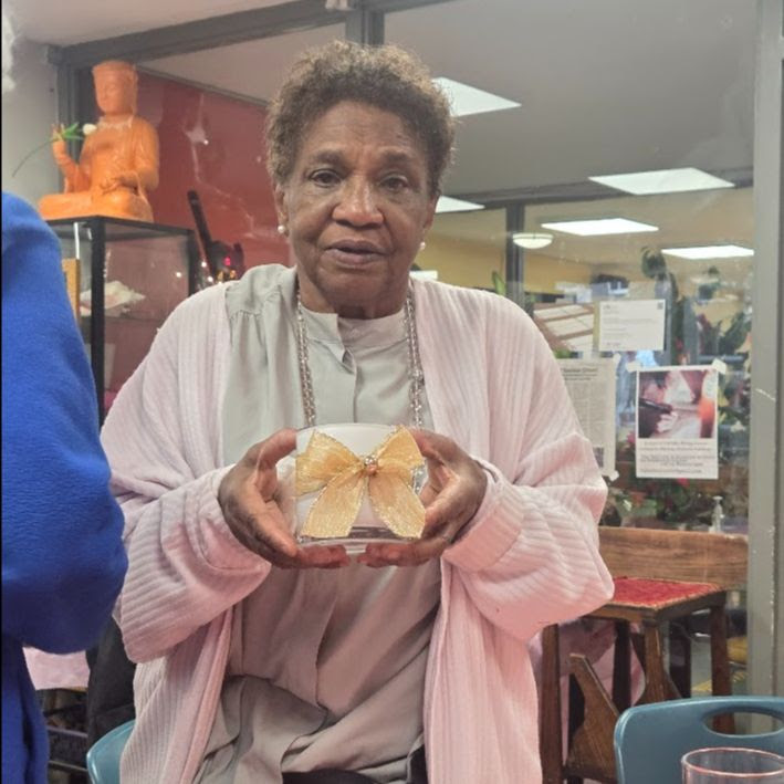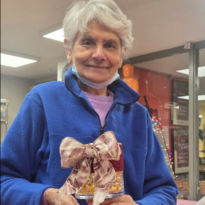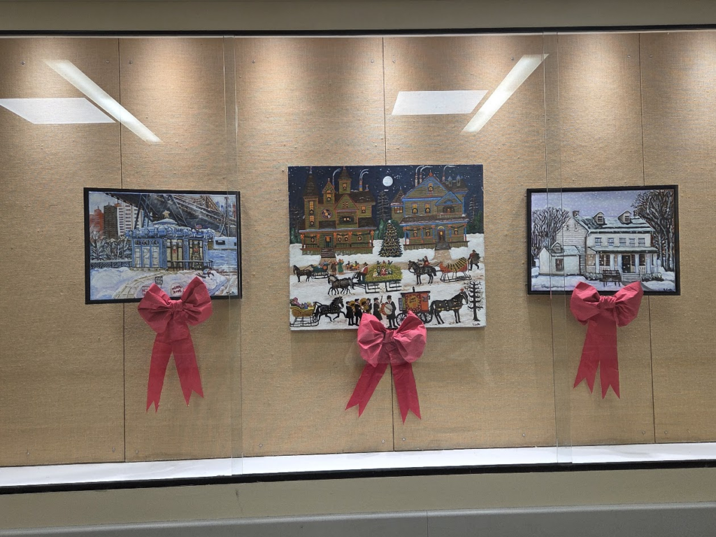 HANSA AND DORIS DISPLAY LOVELY HOLIDAY ART AT THE CARTER BURDEN OLDER ADULT CENTER.