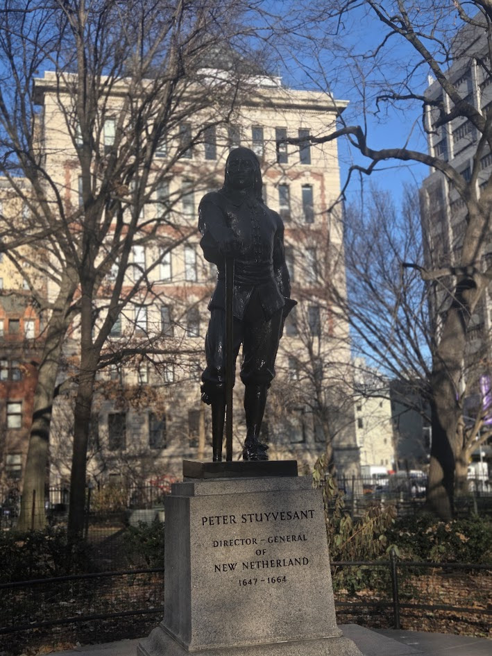 Stuyvesant Square Park, like many other city parks, was extensively rehabilitated in a more populist manner during the 1930s, when the 19th-century plan was modified by Parks Commissioner Robert Moses‘ landscape architect Gilmore D. Clarke, with the addition of comfort stations, playgrounds and other built amenities. The park reopened in 1937; the 1980s saw restorations of the two 1884 fountains, the preservation of the cast-iron fence, and relaying the original bluestone sidewalks in two ellipses, with renovated lawns, shrubs and flower beds. A few old trees, English elm and Little-leaf linden, still flourish. Further contributions to the park have included Gertrude Vanderbilt Whitney‘s Peter Stuyvesant (1941) and Ivan Mestorvic’s Antonín Dvořák (1963, moved here 1997).