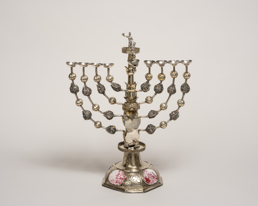 Johann Adam Boller, Hanukkah Lamp, Frankfurt am Main (Germany), 1706–32, silver: cast, filigree, cloisonné enamel, engraved, traced, punched, and parcel-gilt; enamel inlays on copper alloy, 17 3/8 × 14 1/8 × 7 1/8 in. (44.1 × 35.9 × 18.1 cm). The Jewish Museum, New York. Gift of Frieda Schiff Warburg, S 563