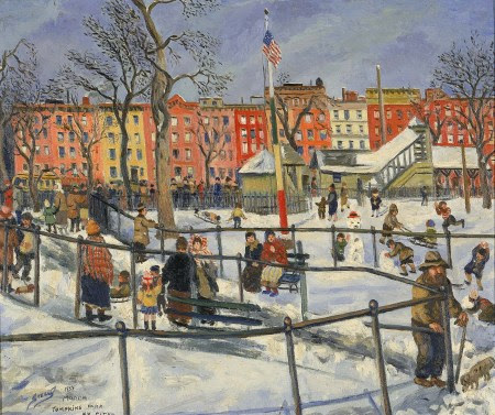 “Children and adults enjoy winter in the park, building snowmen and playing with sleds; the presence of the Stars and Stripes in the center of the work places this as a uniquely American scene.”