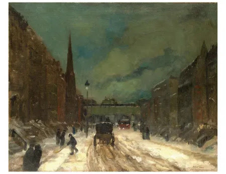 There’s a lot of white in this depiction of a blustery winter day in the New York City of 1911: white snow on the street, stoops, and light poles; white-gray skies filling with factory smoke (or smoke from ship smokestacks?) across a grayish river.