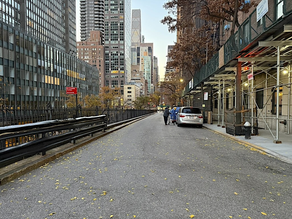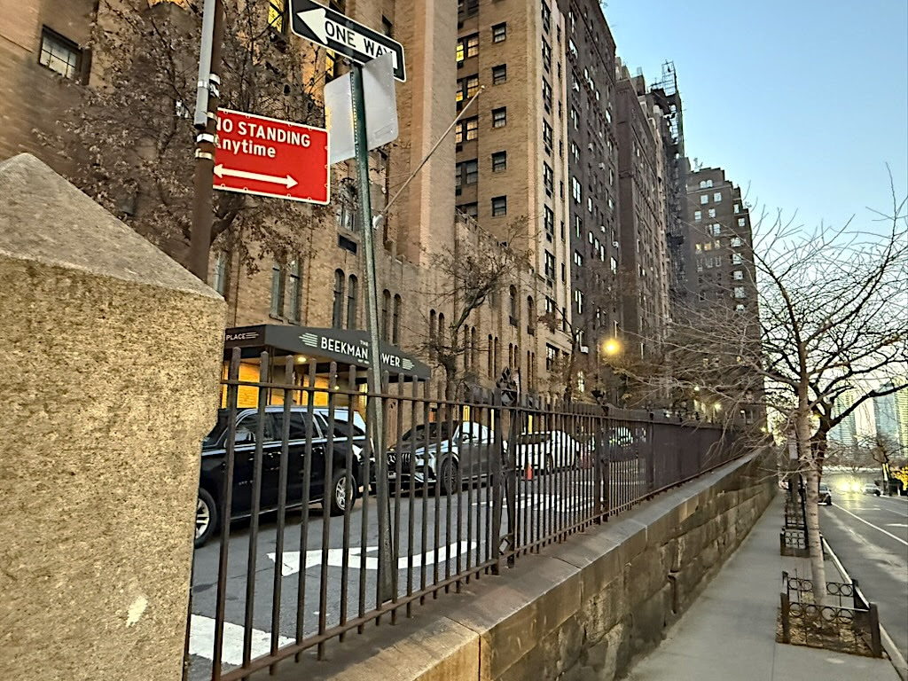 Mitchell Place is an oddity. It isn’t a continuation of East 49th Street, which runs across First Avenue to the East River at a lower level. Mitchell Place is an entity of its own on an incline flanked by 20th century residential buildings on one side and an iron fence on the other.