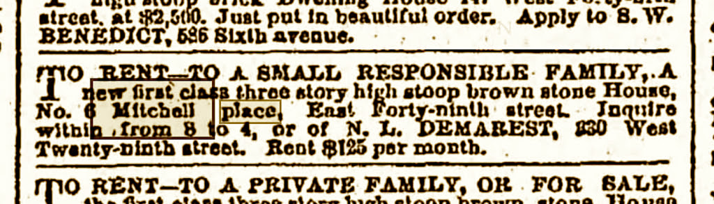 And then something weird appeared in the press in 1896. Apparently, the city had no record of Mitchell Place and did not recognize it as an actual Manhattan street, several papers reported.