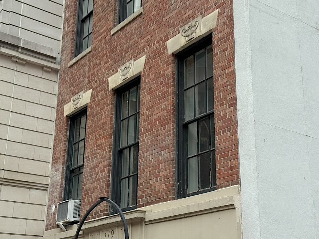 Architectural styles changed as well. Assuming it was part of the original row, Number 119 lost its brownstone front and stoop. Are the Greek urns on the window lintels original or a new feature to give the house a Classical edge? The research is scant.