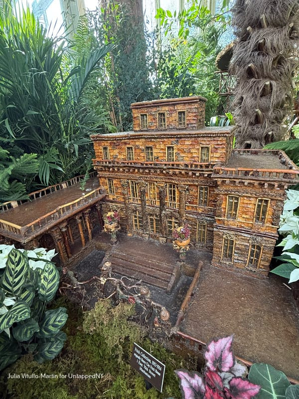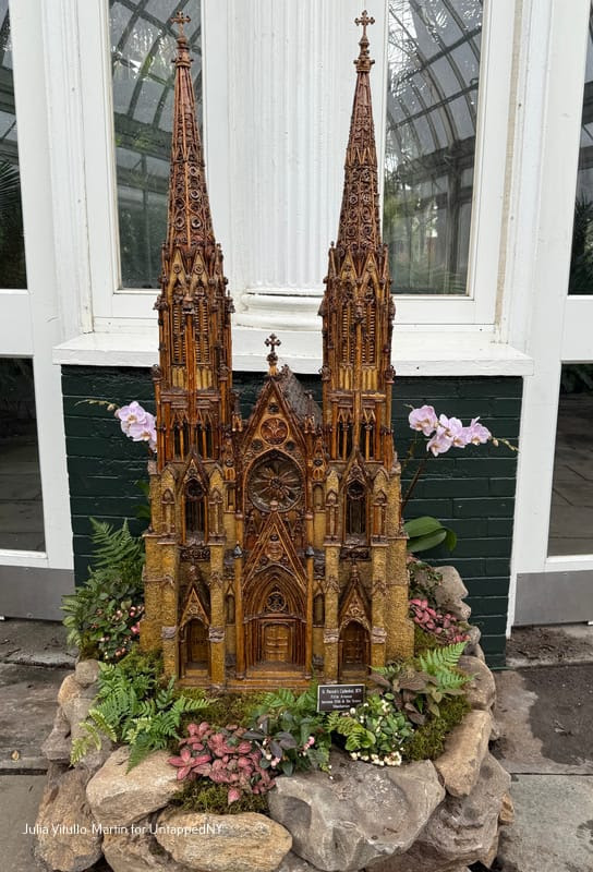 Poe Cottage is far plainer than the magnificent building that Busse replicated next: St. Patrick’s Cathedral in Manhattan. Busse’s botanical St. Pat’s looks remarkably like the real one standing majestically on Fifth Avenue. Designed by James Renwick, Jr., one of the nineteenth century’s finest architects, St. Patrick’s is the largest Neo-Gothic Roman Catholic cathedral in the country. Dolan, who now heads Applied Imagination, says she isn’t sure why her father chose St. Patrick’s as his first major botanical building. But she notes that one huge plus in addition to its fame is its sumptuously decorated facade.