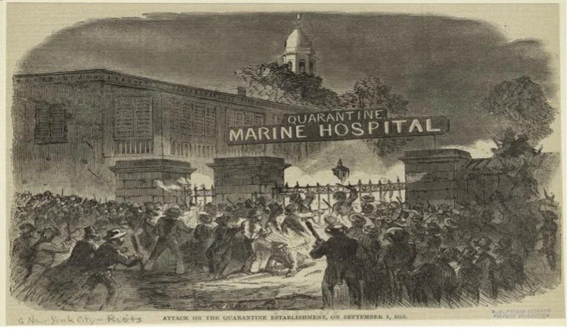 New York City’s borough of Staten Island has a long history of quarantines and public reactions to them. Just over five miles from Manhattan, Staten Island has faced numerous disease outbreaks, with quarantine measures playing a central role in containment efforts. In the nineteenth century, mass immigration and the spread of infectious diseases overwhelmed the city, leading to stricter quarantine enforcement. At the time, immigrant health regulations were managed by municipal authorities and the State Health Office, which operated a quarantine station on Staten Island. The island became a focal point for disease containment, housing sick immigrants upon their arrival in New York. Throughout its history, Staten Island has also witnessed strong public opposition to quarantine measures, sometimes leading to violent protests—including during the most recent COVID-19 pandemic. [1]