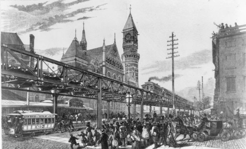The first train on the Gilbert elevated railroad passing through Sixth Avenue, Image via Library of Congress