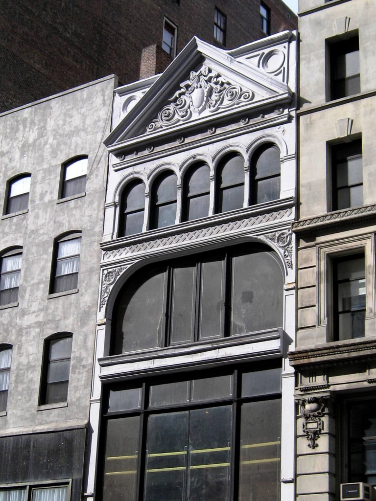 Completed in 1885, Harding’s handsome design focused on appropriate space for the high-end retailers now filling this section of Fifth Avenue. The street entrance featured modern multi-paned arcade windows below a deep panel of glass tiles. Immense expanses of glass, made possible by the cast iron, flooded the showrooms of the second and third floors with sunlight. Above a small cornice and arcade of five openings sat an exuberant parapet featuring a deep pediment filled with intricate ornamentation tied up with a cast iron bow.