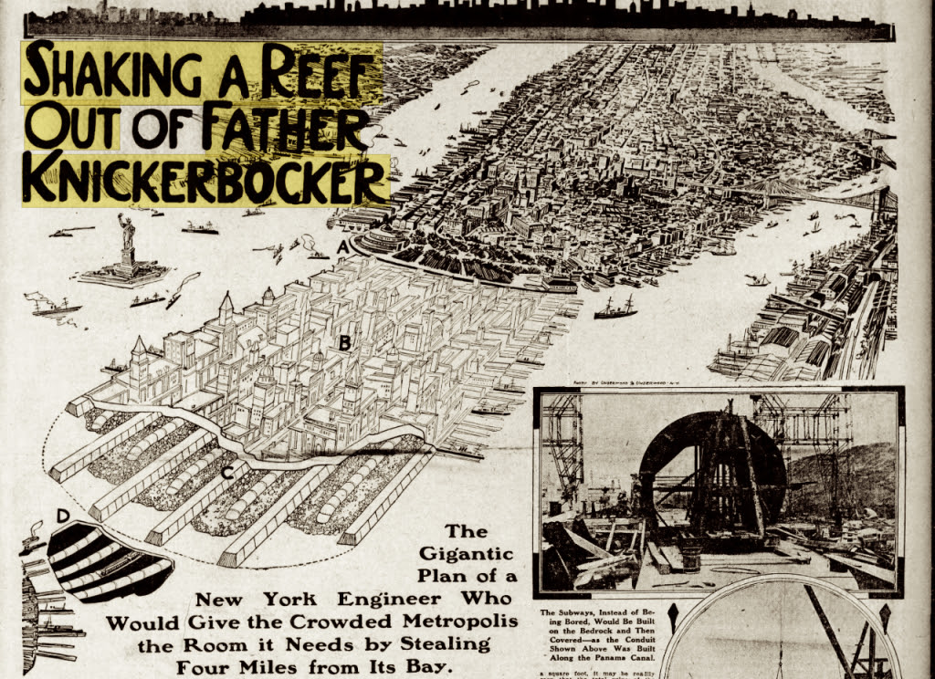 His proposal, popularized in a nationally syndicated newspaper article in June 1911, was to extend Manhattan four miles into New York Harbor, adding 4,100 acres to New York City’s most populated borough.