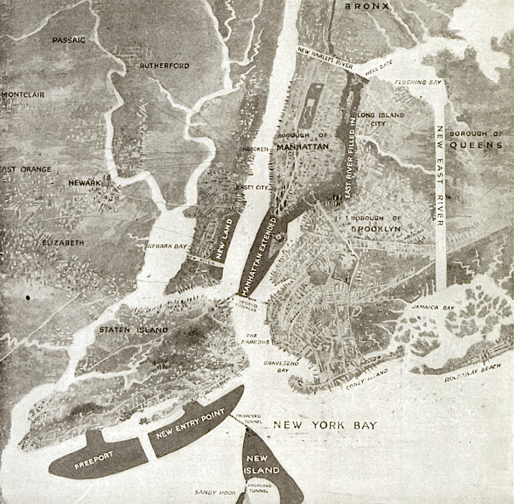 In 1916, he published a proposal in Popular Science not only to build into New York Harbor but to fill in the entire East River (third image), which would reclaim 50 square miles and create “a really greater New York.”