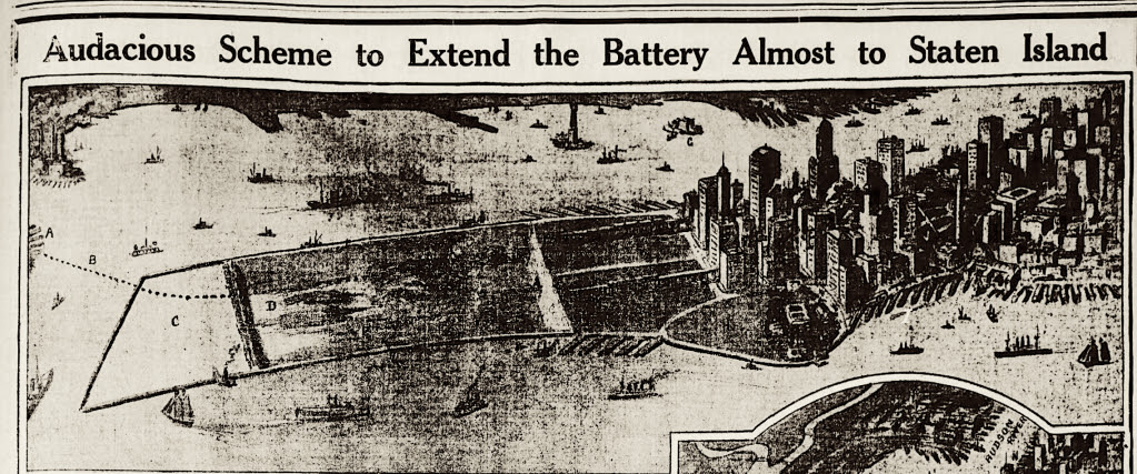 “The method of reclamation to be followed is extremely simple,” he told a reporter. “I would merely erect concrete seawalls from the Battery toward Staten Island for the desired length, and then fill them in.”