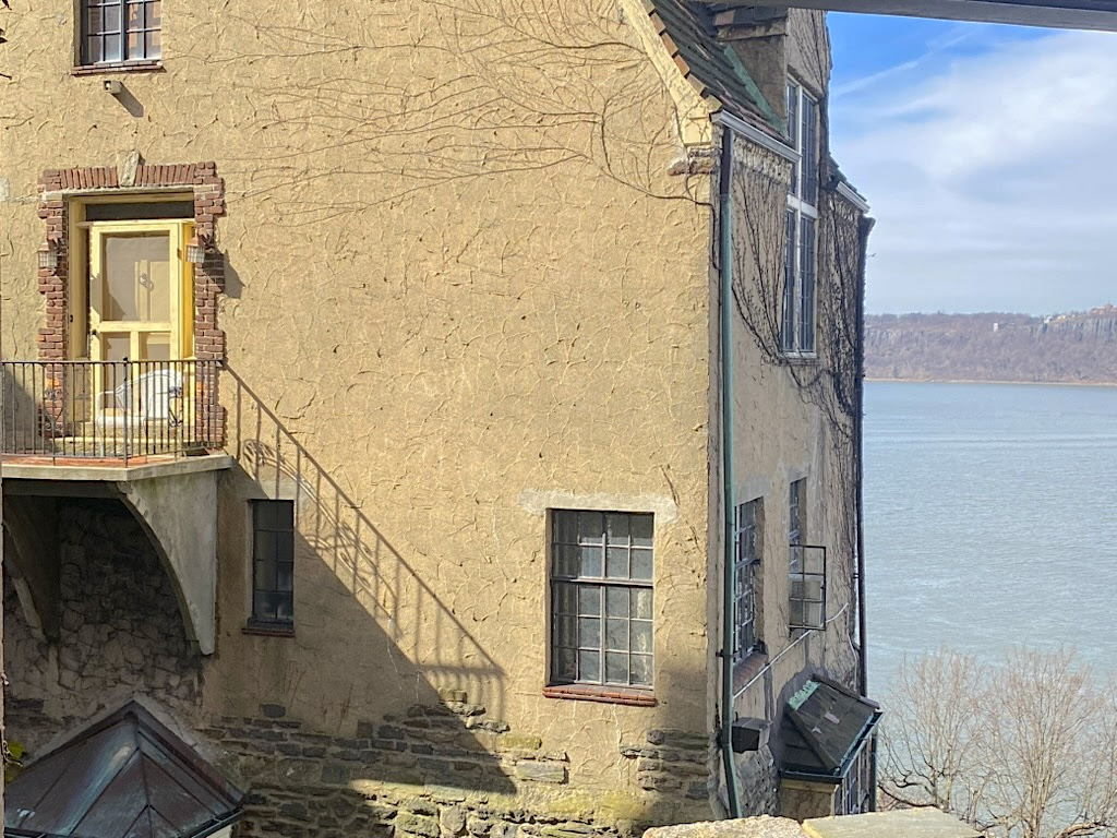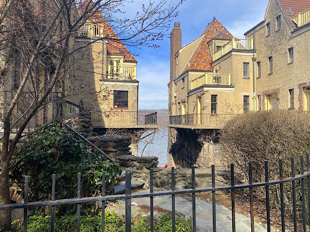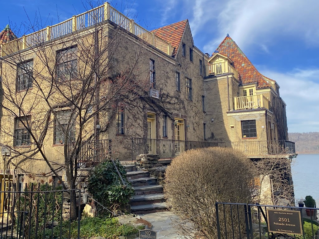 But it’s the middle sister building, the Villa Charlotte Bronte, that stole the show. Built in 1926 next door to the Villa Victoria, the Charlotte Bronte is a romantic fantasy that features two twin buildings bisected by a central sunken courtyard high above the Hudson River.