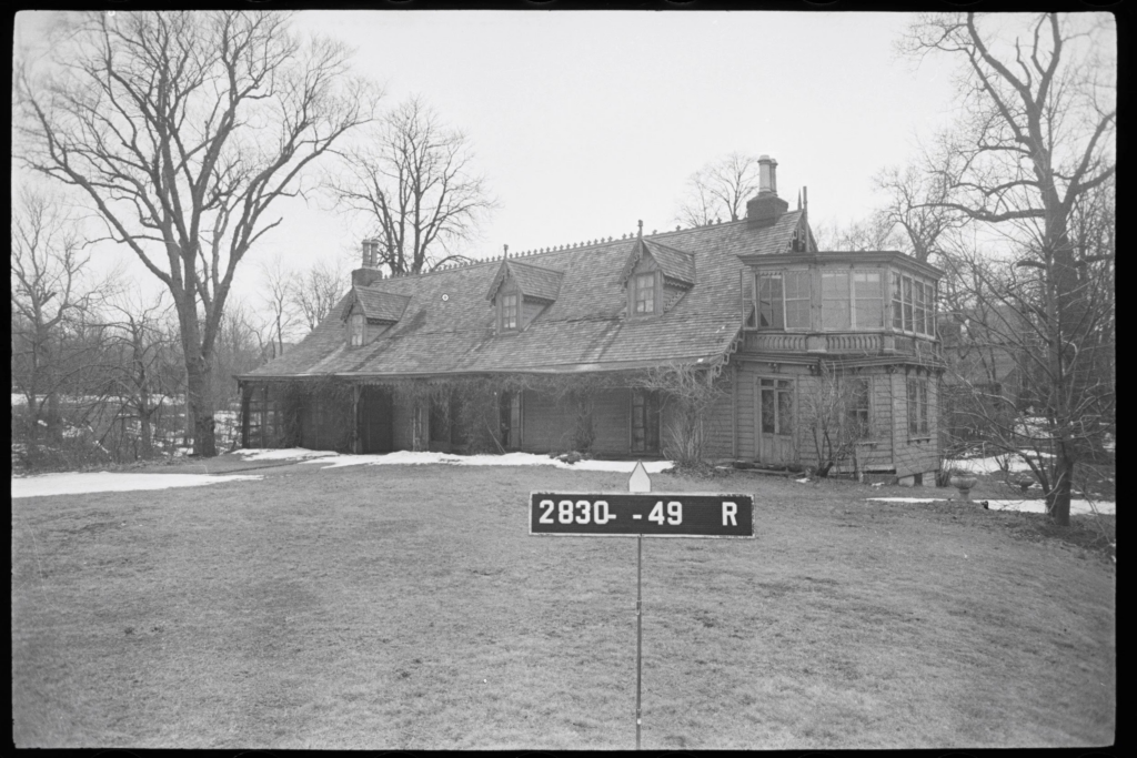 Alice Austen’s grandfather John Austen purchased the family home in 1844. It had been originally constructed as a one-room farmhouse in the 17th century and went through many years of gradual additions and alterations. Austen transformed it to the Gothic Revival style recognizable today. The Library’s vertical file helps to tell the story. The New Yorker magazine printed a “Talk of the Town” article on September 30, 1967. The uncredited author described a visit to “a benefit punch-and-supper party being given by an organization called—with portmanteau clumsiness characteristic of so many ardent champions of good causes—Friends of the Alice Austen House and Esplanade.” At that time, according to the article, a real-estate syndicate owned the house along with two parcels of adjacent land that they intended to demolish to make way for a cluster of high-rise apartment buildings. The article described the house, “long, low-roofed, and engulfed in the leafy jungle of a long-abandoned Victorian garden,” surrounded by a “jumble of old barns and outbuildings in the shadow of an enormous horse-chestnut tree.”