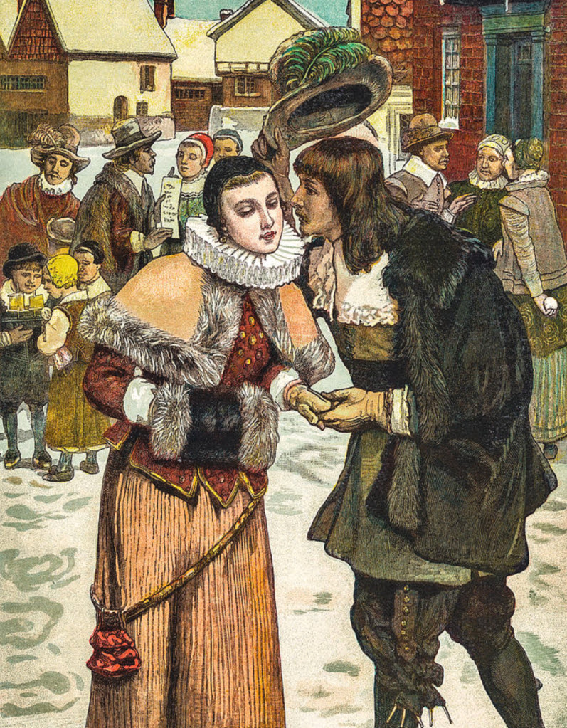 Boughton also created the third image of Dutch colonists celebrating the holiday in New Amsterdam in 1636, with Dutch-style gabled roofs in the background.