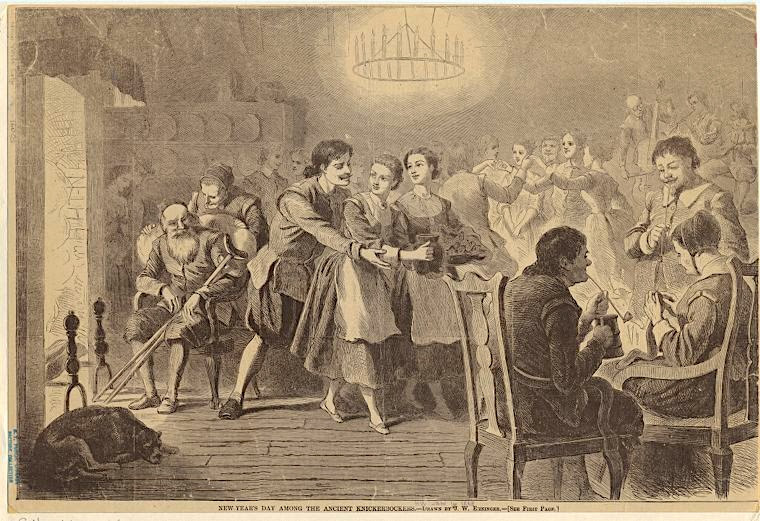 And the middle black and white image comes from an 1868 illustration by painter John Whetten Ehninger, who imagined a New Year’s Day of dancing, flirting, and pipe smoking among what he called the “Ancient Knickerbockers.”
