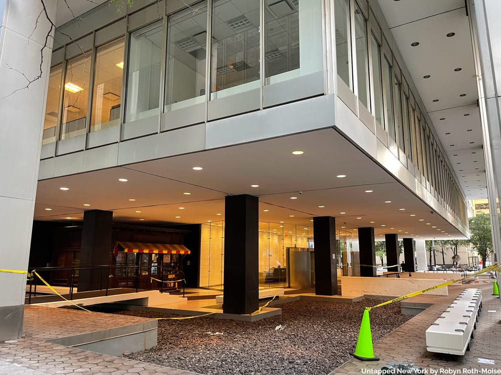 The office building is currently being transformed into roughly 650 rental apartments. From peeking through the construction barriers, it appears that all of the art installations at ground level have been removed, and when we visited the site in September, the inside of the store was empty and the lights were off.