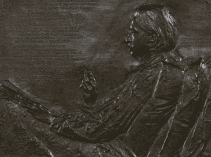An early biographer of Robert Louis Stevenson argued that TB had enhanced the author’s talent. A sculptural relief by Dublin-born Augustus Saint-Gaudens (Irish mother; French father), depicts the novelist during a stay in New York City in 1887/8. The writer is portrayed with long hair, cigarette in hand, looking sharp and alert, despite being propped up by a stack of pillows in bed. Stephenson spent time in Davos as a patient. Illness enforced his creative presence.