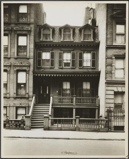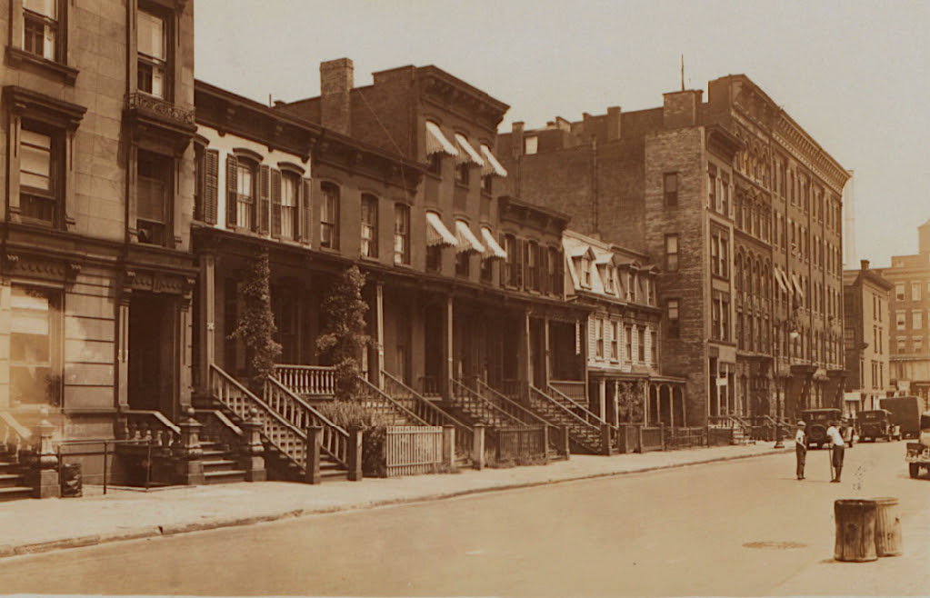 (Below, similar houses with front porches on East 128th Street between Park and Madison Avenues, 1932