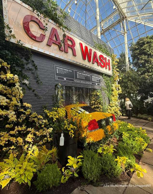 This is one adorable car wash, with an adorable, carnation-covered yellow taxi pushing in to be washed. The current taxi was inspired by a previous installation, Taxi!!!, at the Queens Botanical Garden. MFF says that his tribute to the yellow cab “embodies diversity, tenacity, imagination, and brilliance.”