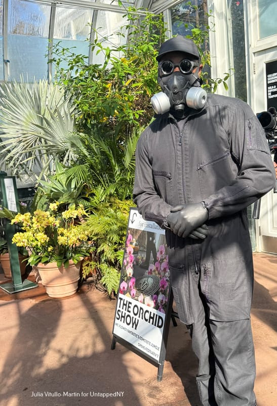 But then Alicia Keys and Jay-Z in their song, Empire State of Mind, called New York the “concrete jungle where dreams are made of,” a place where anything is possible for the talented and the ambitious. “These streets will make you feel brand new, big lights will inspire you.”Now the New York Botanical Garden, in its glorious 23rd annual orchid show, introduces New Yorkers to Mr. Flower Fantastic’s Concrete Jungle. And what a gorgeous, innovative, endearing jungle it is. MFF, as Mr. Flower Fantastic prefers to be called, maintains his anonymity with a cap, dark glasses, rubber gloves, and the gas mask that he needs for his severe pollen allergies. A self-taught floral artist, MFF developed his love for flowers growing up in Queens, tending to his mother’s garden.