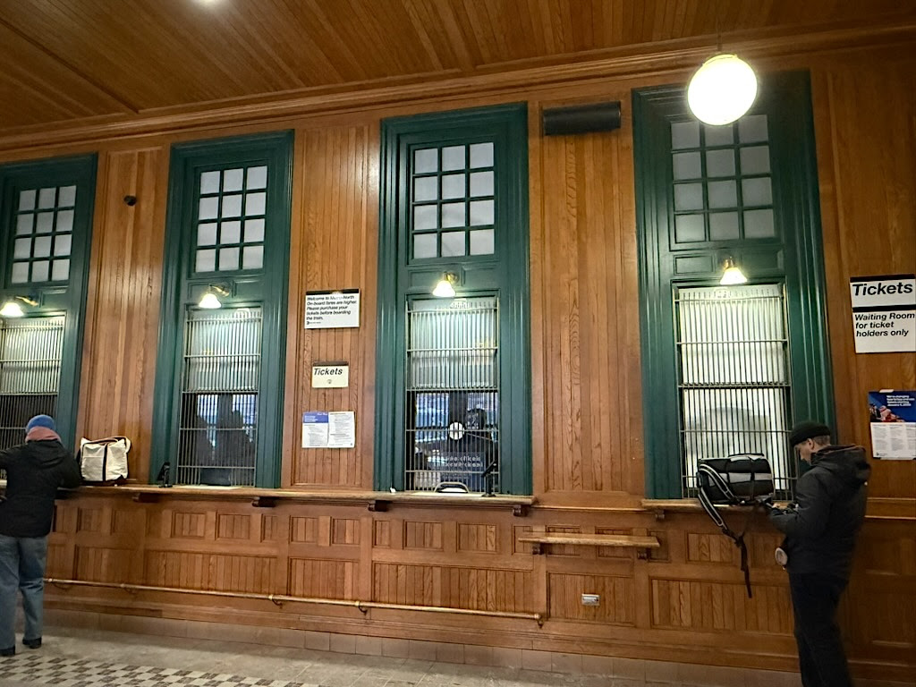 But once you walk inside, you’ll find yourself in a roomy rail station with a wall of ticket counters and a spacious waiting room straight out of the Gilded Age.