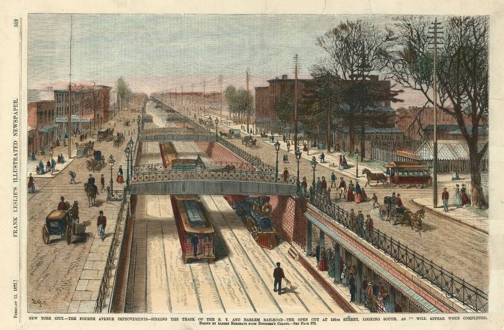 Park Avenue, then known as Fourth Avenue, had train tracks running at street level through lower Manhattan since 1831. Besides being noisy and unsightly, the street-grade tracks were extremely dangerous to pedestrians.