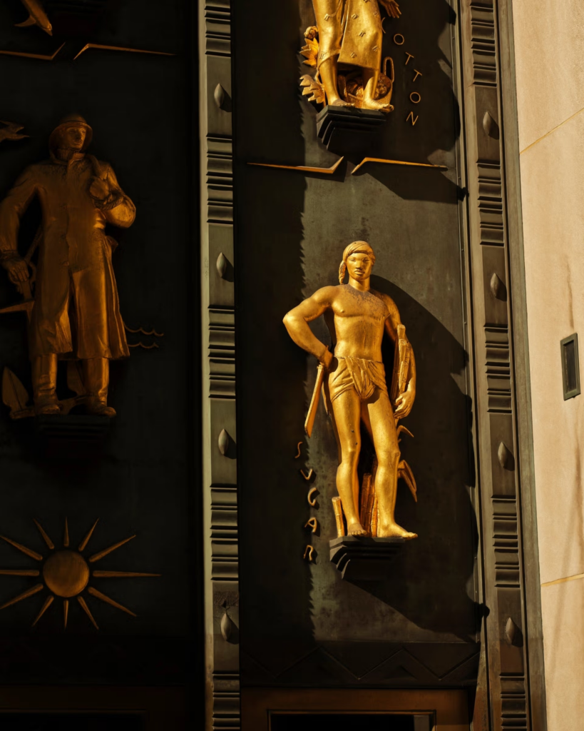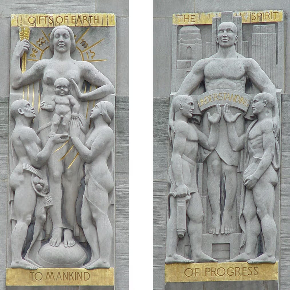 The nine gilded allegorical figures on this large bronze panel represent industries that were once considered major sources of income for the British. Depicted as beautiful, unemotional and idealized, they include Coal, Fish, Salt, Tobacco and Sugar. Australia is symbolized by Wool, Canada by Wheat and Africa by Cotton. A stylized sculpted sun is symbolic of the saying, “The sun never sets on the British Empire.” In New York City, Jennewein’s works can also be found at the Brooklyn Central Library and the Metropolitan Museum of Art.