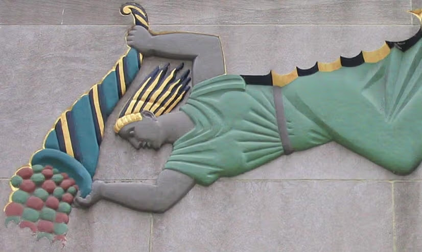 This polychrome-painted stone carving depicts a messenger soaring from the clouds, emptying an overflowing horn onto the earth. Lee Lawrie wrote that it symbolizes “the plentitude that would result from well-organized international trade”, a theme compatible to the activities of the building. The figure’s downward angle, her flowing golden hair and the dramatic spilling of contents from her cornucopia all skillfully convey a feeling of motion and energy.