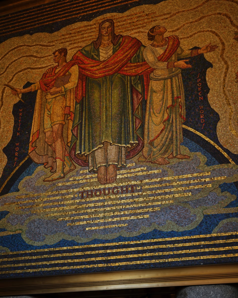 This mosaic of small glass tiles (tesserae) is composed of over one million glass tiles in two hundred and fifty colors, each hand-cut and hand-set. The work is a narrative concerning the triumph of knowledge over the evil of ignorance. The central figure of thought (intelligence) stands above the world, controlling the action in the mosaic; the two other powerful figures in this piece are spoken words and written words. Other figures symbolize creativity, ideas and intellectual efforts. The mosaic’s message is that thought will propagate new knowledge and advance civilization.