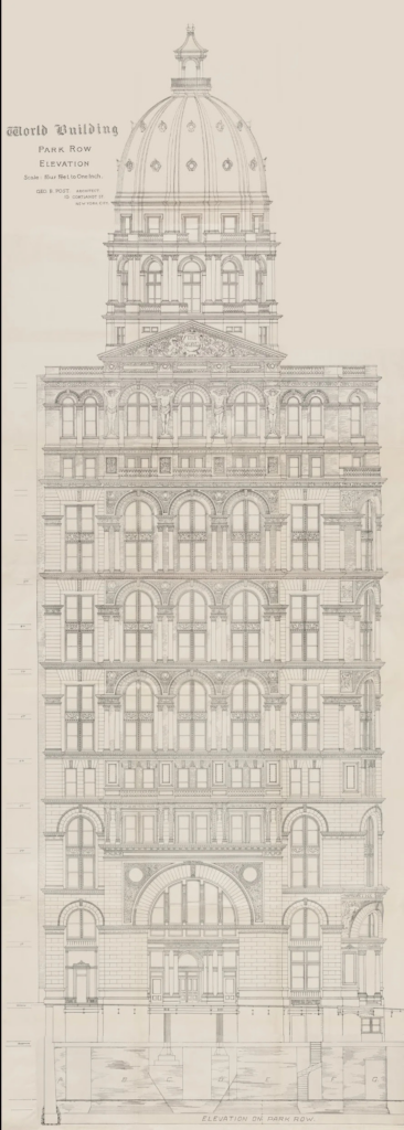 The 309-foot New York World Building (officially known as the Pulitzer Building) was the tallest skyscraper in the world when it opened in 1890. Located on Newspaper Row (today’s Park Row) across from City Hall and next to the Tribune, Times, Herald, and Sun newspaper buildings, it served as an office building and vertical factory, with newspaper production starting in the tower’s dome – under the publisher Joseph Pulitzer’s direction – with photoengraving, editorial and reportorial staff meeting and compiling photographs and news stories in the sun-light upper floors. Production then traveled down to the linotype composing room, then to the giant presses in the cellar, where newsprint paper making machines printed 48,000 8-page papers per hour. Paperboys waited outside on the curb for the cut, pasted and folded papers to be distributed.