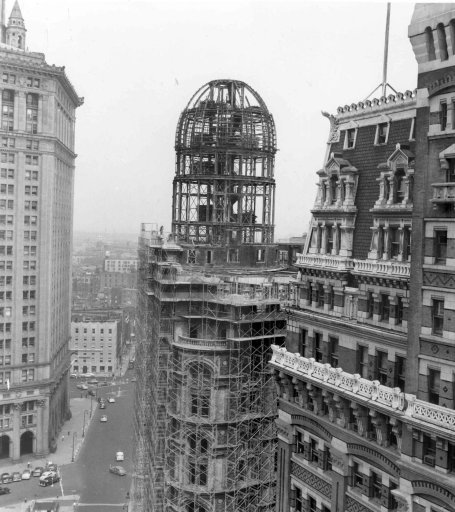 World Building demolition, 1955. Tribune Building on the right before demolition.