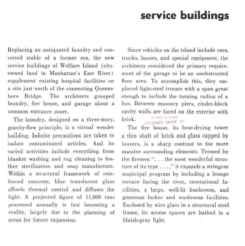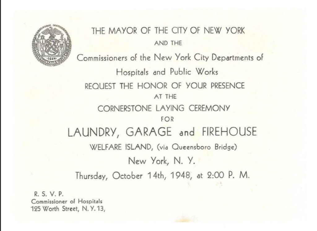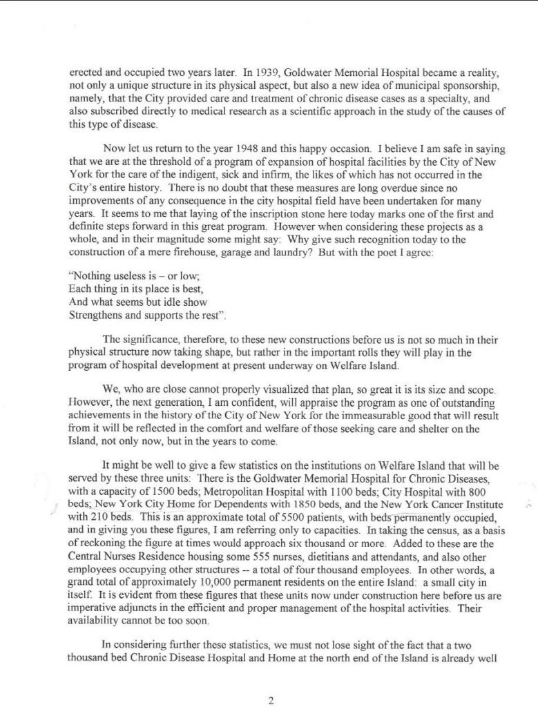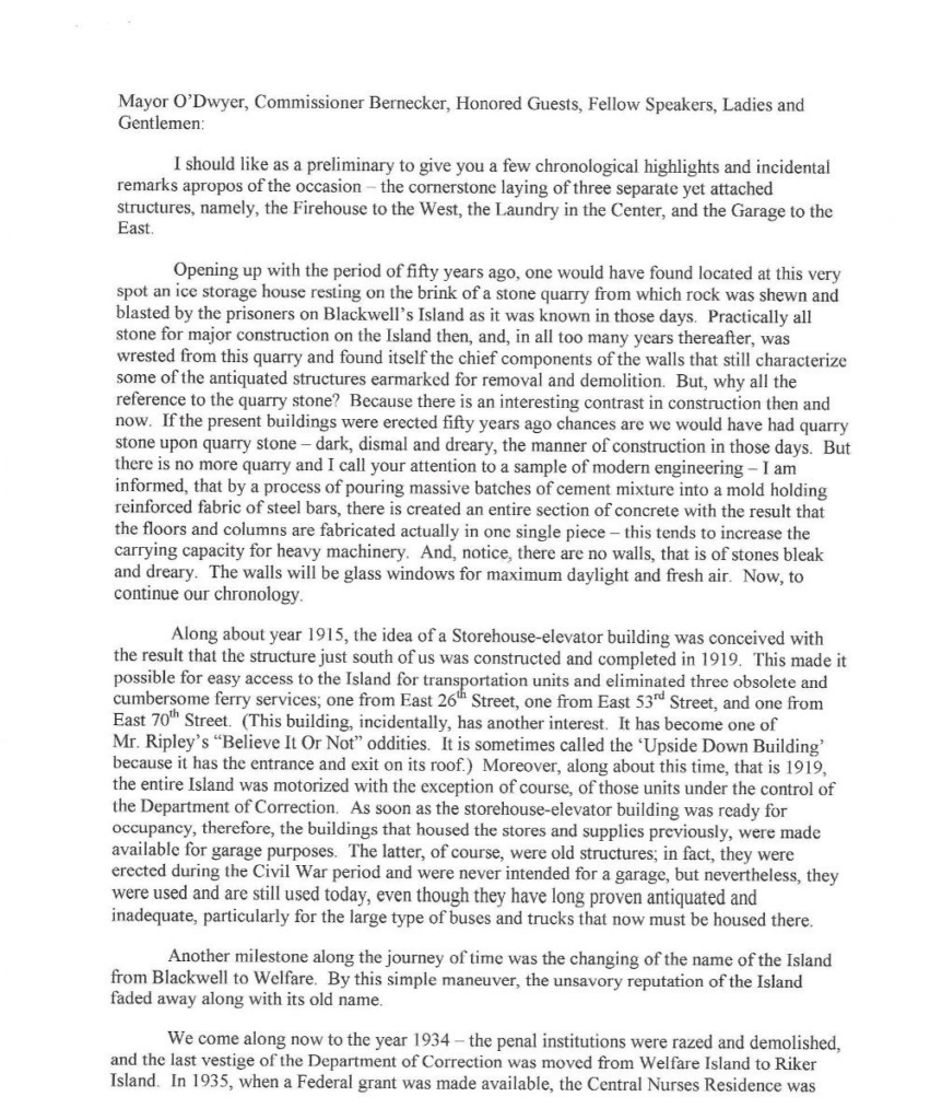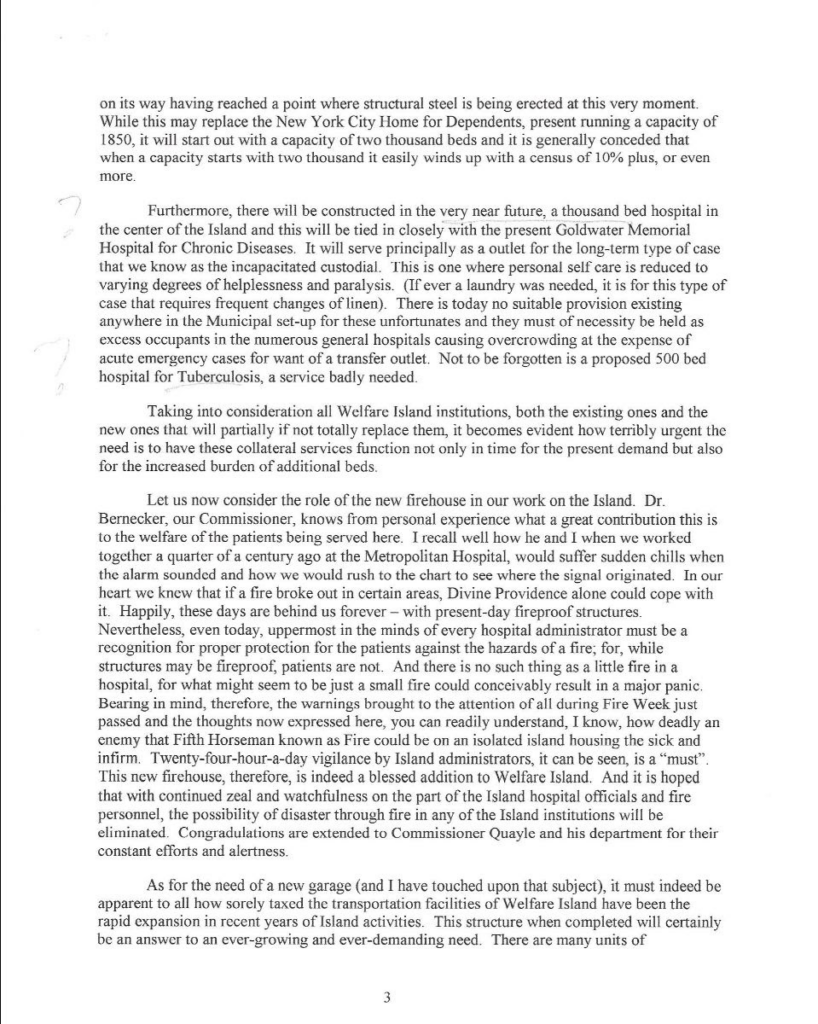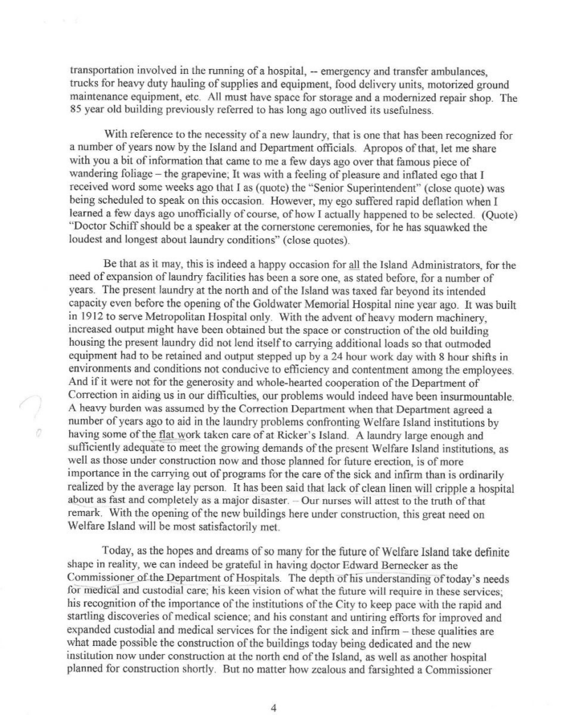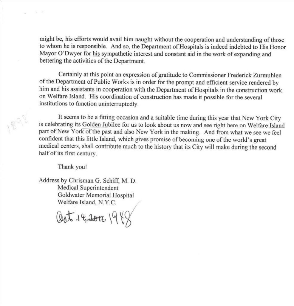 On October 14th, 1948 Chrisman Schiff, Medical Superintendent of Goldwater Memorial Hospital delivered a speech at the dedication of the Laundry, Garage and Firehouse on Welfare Island.