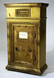 This receiving box, which was located at the bottom of the mail chute, was manufactured by James G. Cutler, who received patent #284,951 for his design. which stated that the box must “be of metal, distinctly marked ‘U.S. Letter Box,'” and that the “door must open on hinges on one side, with the bottom of the door not less than 2’6″ above the floor.” If a receiving box was to be placed in a building that was more than two stories high, the bottom of the box was required to be outfitted with an elastic cushion to “prevent injury to the mail.”