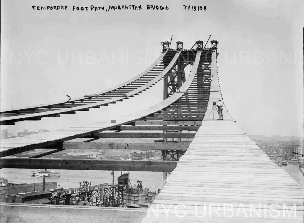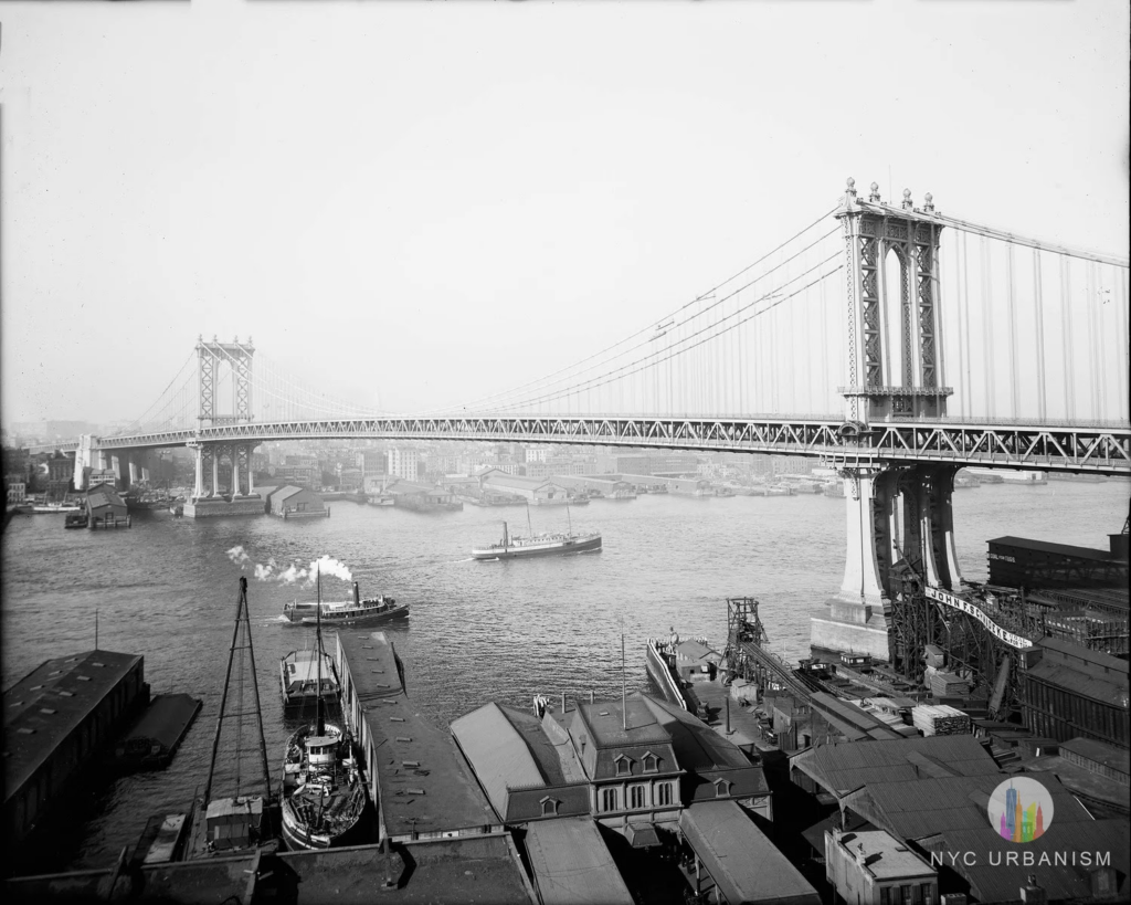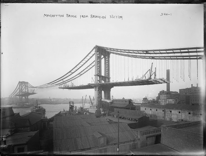 110 Years ago today the Manhattan Bridge opened to traffic. The bridge was the last of the East River bridges to be constructed, following the Brooklyn Bridge (1883) Williamsburg Bridge (1903) Queensboro Bridge (1909). Utilizing a weight-saving Warren Truss, the bridge was the first modern steel suspension bridge and paved the way for future record-breaking bridges. The grand Beaux-Arts arch and collonade entry on the Manhattan side of the bridge was designed by Carrere & Hastings and opened in 1915. On the Brooklyn side, two female figures representing Brooklyn and Manhattan designed by Daniel Chester French flanked the entrance to the bridge. The statues were later moved to the Brooklyn Museum.