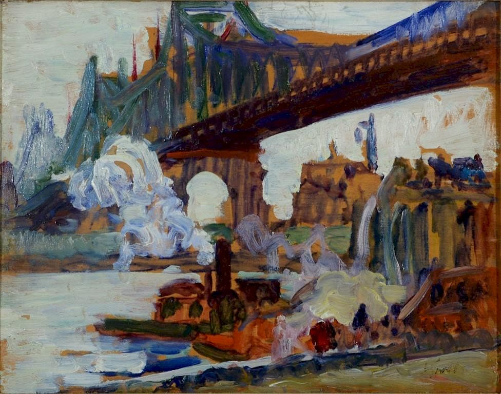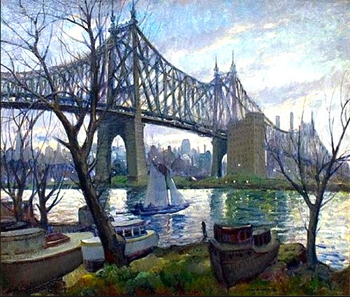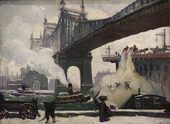 “Queensboro Bridge,” from 1912, the painting at the top of the page, is one such example. The majesty of the relatively new bridge (only three years old here) takes center stage, but the monolithic city looms behind it.