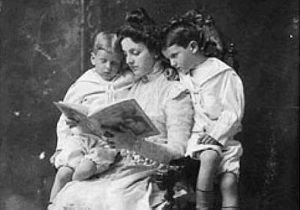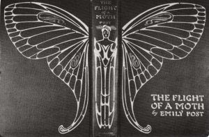 Illustrations, from above: Emily Post and her two sons, ca. 1897; 12 West 10th Street, Greenwich Village, home of Emily Post (courtesy Village Preservation); a black and white photo of illustrator C B Falls’ case stamp design for the binding of The Flight of a Moth, 1904; and Etiquette by Emily Post (1922).