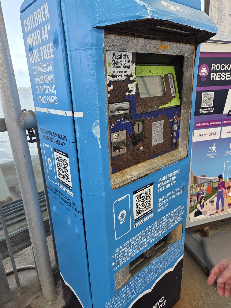 TIME FOR NEW TICKET VENDING MACHINES. THIS ONE AT ROCKAWAY PIER, IS IN SHODDY CONDITION AND CREDIT CARD VENDING DOES NOT FUNCTION