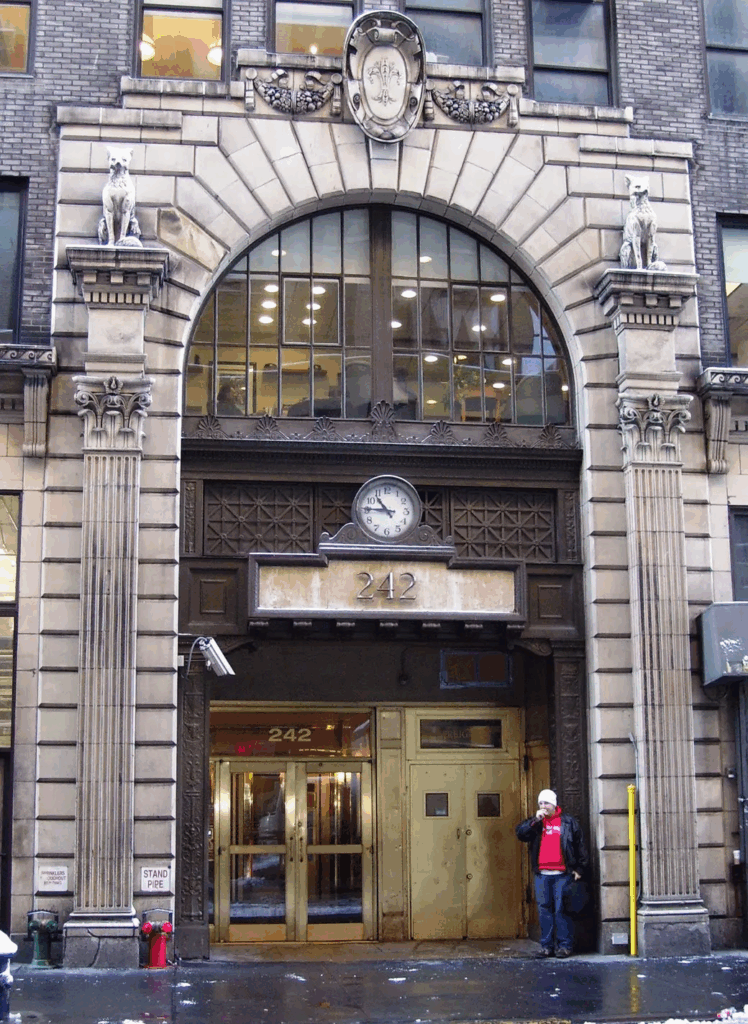 The entrance to the limestone building is flanked by two fox sculptures. The facade of a Greek temple sits at the top, which was likely visible from Penn Station during its early years, as 6sqft previously reported.