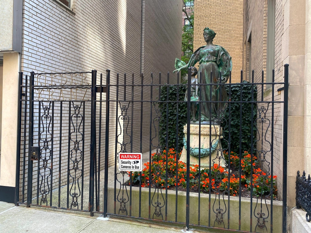 When the Liederkranz moved to the Upper East Side, Polyhymnia came along, situated ever since in the small courtyard behind the wrought iron fence.